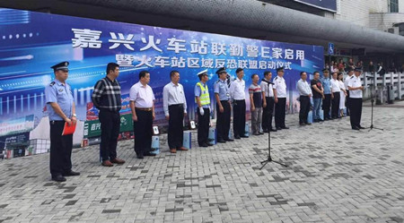 在啟動儀式上,嘉興市反恐怖工作領導小組辦公室常務副主任、市公安局黨委委員、副局長李新寶,嘉興市南湖區委常委、區反恐怖工作領導小組副組長、市公安局黨委委員、區公安分局局長張順榮為嘉興火車站聯勤警E家揭牌,并為公交公司在內的17家聯盟單位授牌。