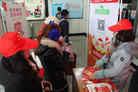 活動當天,青年志愿者們早早來到客運北站,戴上小紅帽,熱情地向旅客介紹國鴻汽運公司微信公眾號、巴巴快巴購票方式,提醒旅客關注公司微信公眾號或下載巴巴快巴APP,領取福字門貼、窗花、紅包袋等新春禮包。