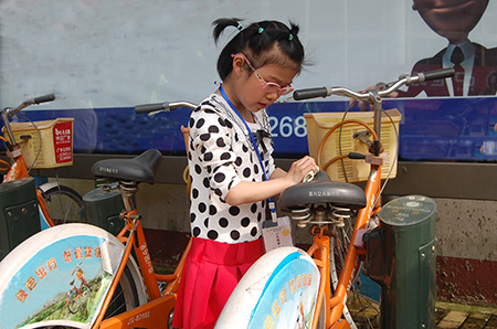 4月17日下午,公共自行車公司迎來一群可愛的小朋友,這是青鳥青鳶項目組組織的“精彩周末,公益出行”志愿活動,這群小朋友就是這個活動的志愿者。小志愿者們拎著小水桶,拿著抹布,有模有樣地擦洗起公共自行車來。一個個小小的身子掩映在自行車中,只露出小小的腦袋。在小志愿者們的辛勤勞動之下,橙色的自行車換上一副嶄新的面貌。通過這樣的活動使愛護公共財物、踐行綠色出行的種子扎根幼小的心靈,同時也向廣大市民傳遞了綠色出行的理念。