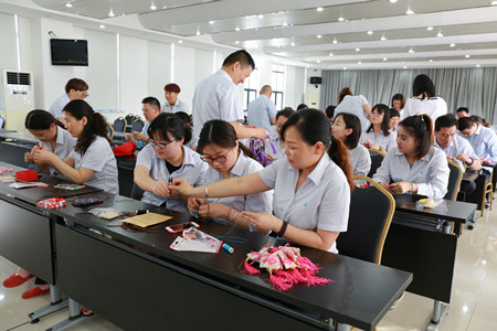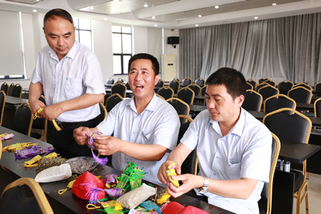 在活動開展前,公司工會精心策劃,提前準備了艾葉、薰衣草、具有驅蚊效果的中藥、針線包以及布料等制作香囊的材料。活動現(xiàn)場熱鬧非凡,公交員工們圍坐在一起,共同觀看了香囊制作步驟圖,隨后大伙兒紛紛拿起香囊材料,擼起袖子,摩拳擦掌,一副躍躍欲試的樣子。手工活比較巧的女同胞們大膽嘗試了難度系數(shù)較高的手工縫制香囊,她們拿起步驟圖仔細研究和琢磨,還時不時地交流技巧和心得。“陳姐,這個藏針縫法我們倆看了好幾遍說明,但還是不得要領,您教教我們吧。”“樊師傅,您看我這樣縫對嗎?”許多參與活動的80后、90后公交員工都是第一次制作香囊,她們在老師傅們的親自示范下最終獨立完成了縫制、裝香料、封口配繩、穿珠等工序,當一個個飽滿又精致的三角香囊做好后,她們的內心油然而生一股成就感,紛紛拿起手機拍照,在朋友圈曬出自己的手工成果。男同胞們也不甘示弱,選擇了相對比較簡單的手工灌裝香囊,你拿袋子,我裝香料,大家分工配合,不一會兒就做了許多漂亮又實用的香囊,得到了在場女同胞的夸贊,難得展現(xiàn)了硬漢柔情的一面。