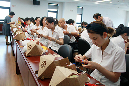 現場除了本就心靈手巧的女同胞外,還不乏許多看似“笨拙”的男同胞。然而,當他們放下平時握慣的方向盤,拿起繡花針做起針線活時,卻也絲毫不馬虎,穿針引線、縫合香包,架勢和手藝一點也不遜色。但兩個多小時做下來,他們也不禁感慨:“做香囊可比開汽車難多了,細心、耐心、恒心一樣都不能少,但能學到一門傳統手工藝術,確實是一件很開心的事情!”雖然很多員工都是第一次自己動手制作香囊,但大家都很認真,仔細聆聽,主動請教,當看到自己辛辛苦苦的勞動成果后,都紛紛拿出手機拍照,并發在微信朋友圈與朋友們分享。