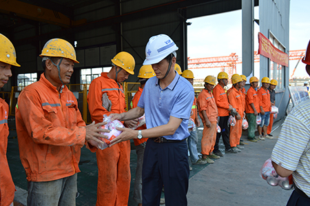 一線工友們拿著防暑降溫物品,個個喜笑顏開,深切的感受到了領導的關懷,在酷熱的夏日,心頭泛起清涼的氣息,紛紛表示將全力確保生產安全及施工質量,為嘉興工程建設貢獻一份力量。