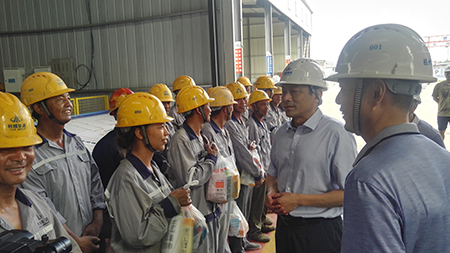 8月2日,省交通運輸廳廳長郭劍彪、副廳長趙雁、省交通工程監管局局長邵宏一行來到杭州灣大橋北接線(二期)工程TJ02標段梁板預制廠,看望并慰問在高溫天氣下堅守在一線的現場施工人員。市政府副秘書長蔡山林、市交通運輸局局長顧國強、集團公司董事長沈蘭冠、副總經理李建國等陪同慰問。