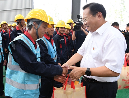 在土建1標段鋼筋智能集中加工中心,張兵與建設工人一一握手,詳細了解他們的工作生活情況以及相關防暑降溫措施,并為他們送上了防暑降溫用品和慰問金,感謝他們為快速路建設付出的辛勤勞動,囑咐大家在做好本職工作的同時,注意防暑降溫。