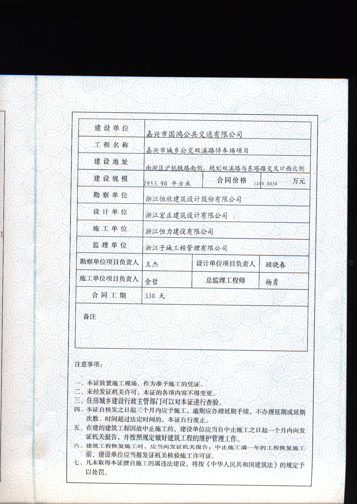 嘉興市城鄉公交雙溪路停車場項目建筑工程施工許可證