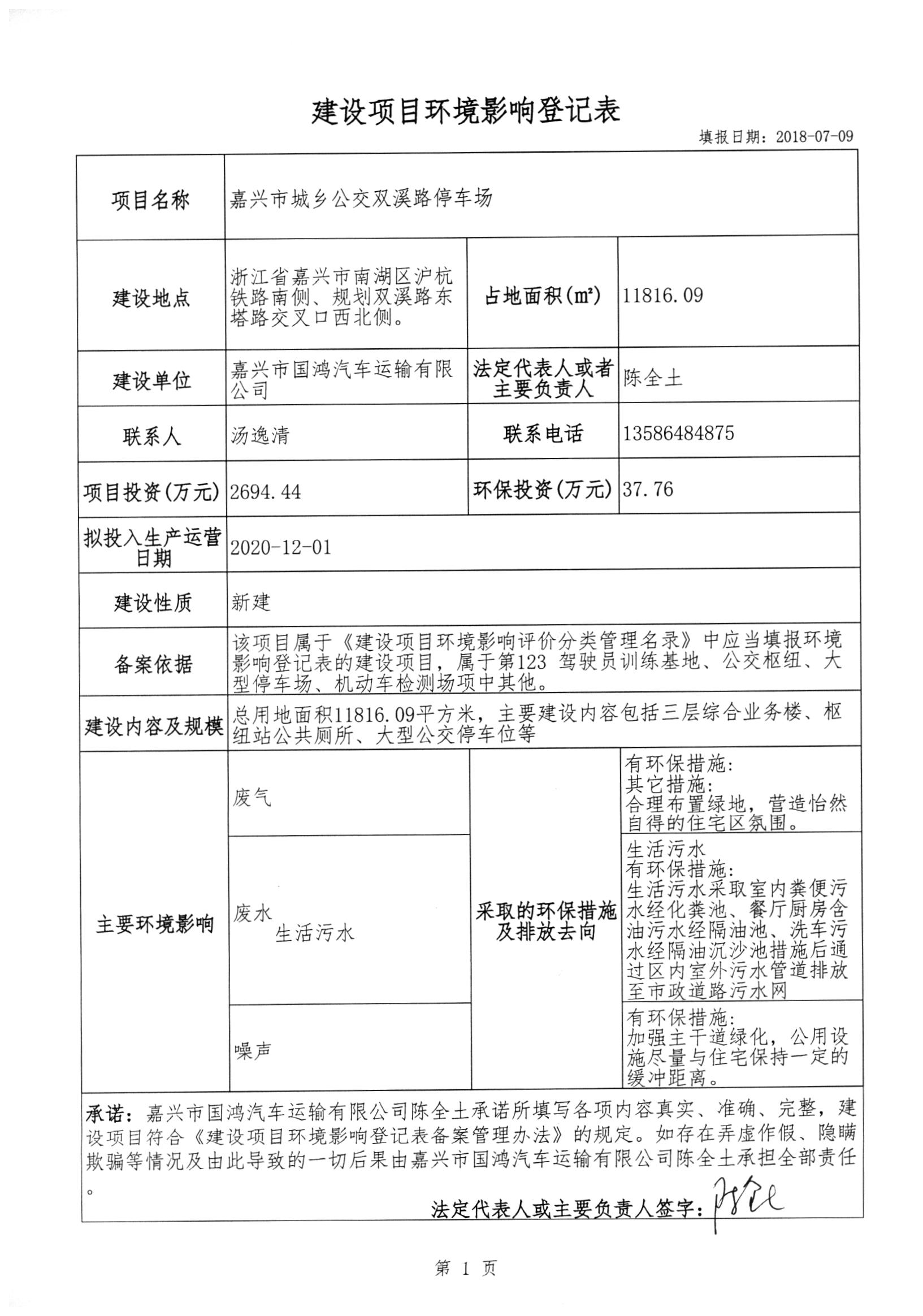 嘉興市城鄉公交雙溪路停車場建設項目環境影響登記表