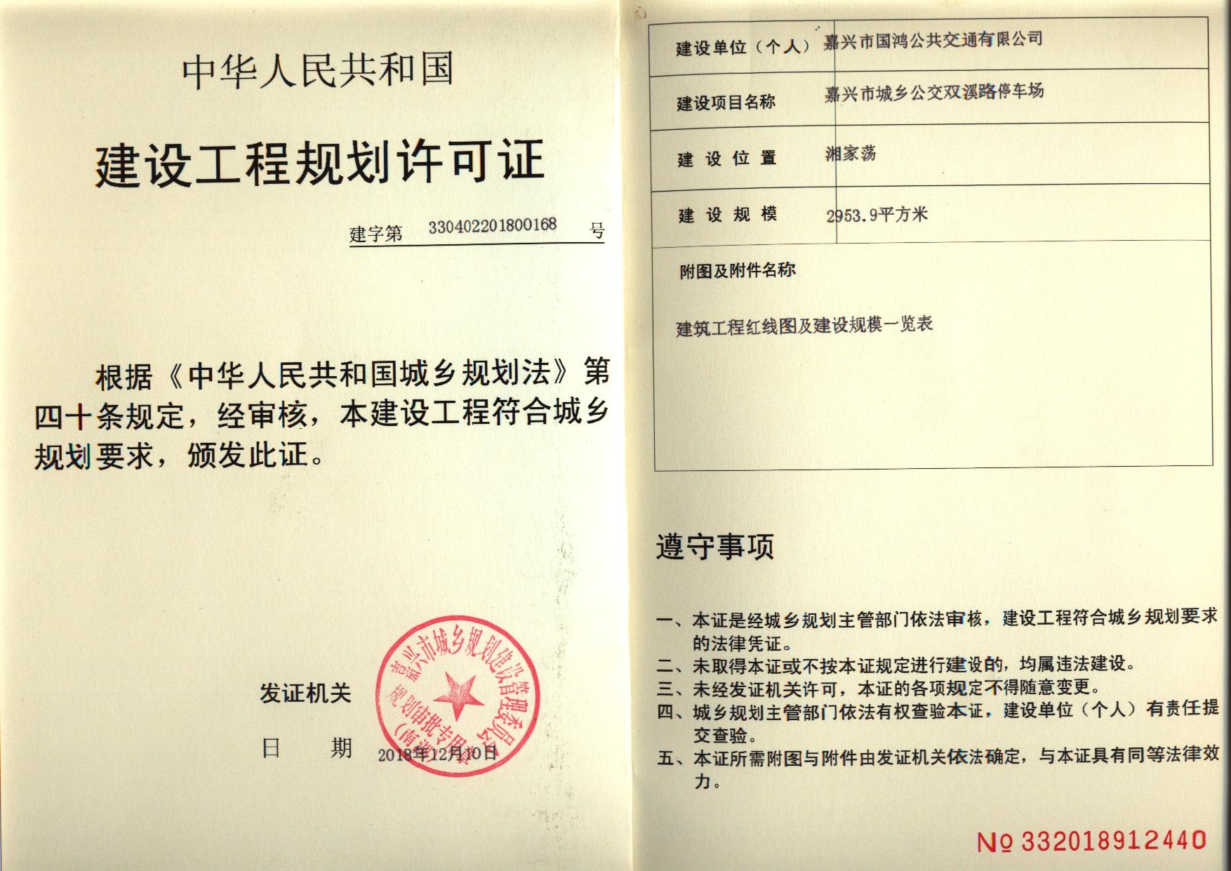 嘉興市城鄉(xiāng)公交雙溪路停車場(chǎng)建設(shè)工程規(guī)劃許可證